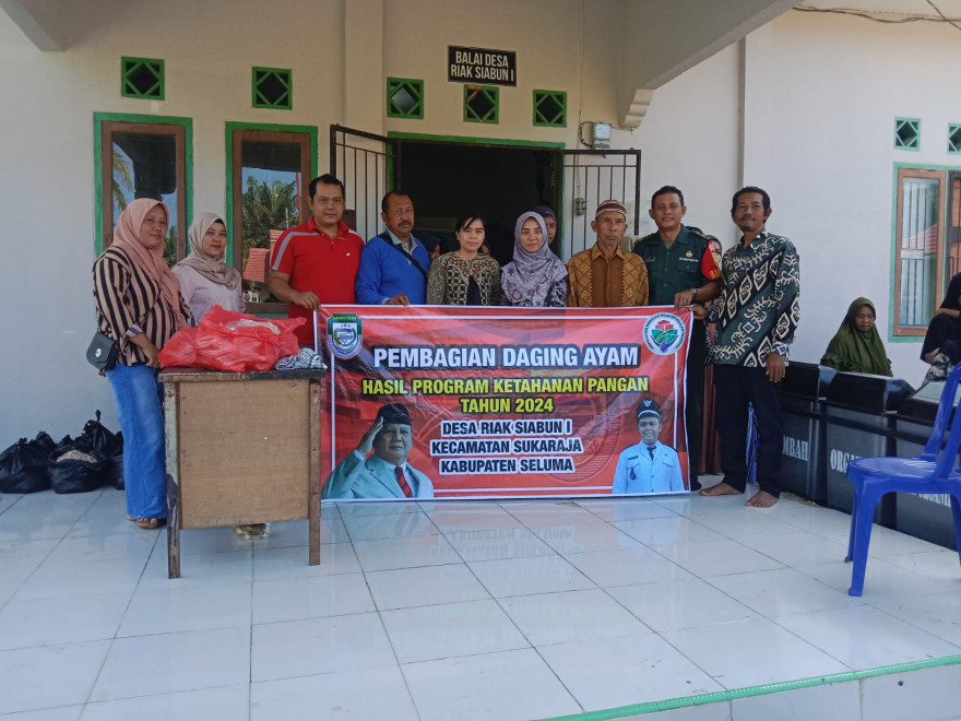Pemerintah Desa Riak Siabun I Kecamatan Sukaraja Kabupaten Seluma merealisasikan kegiatan program Ketahanan Pangan Desa Tahun anggaran 2024. Hasil Program Ketahanan Pangan tahun 2024 berupa daging ayam dibagikan kepada tiap Kepala Keluarga yg ada di Desa Riak Siabun I. Kegiatan ini dilaksanakan di Balai Desa Riak Siabun I Pada Kamis, (12/06/2025).